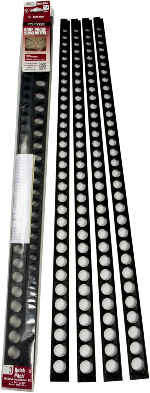 Goof Proof Shower Kit - Goof proof shower 7 in.. The standard kit fits 3' x 5' showers Quick pitch® is a revolutionary new product that will completely change the way in which a mortar bed is installed. Shower curbs included and designed not to puncture the liner. Quick pitch standard shower kit. Customizable to 6 length combinations ranging from 27 to 60 tileable insert top (no metal grates available) with female receivers to attach quick pitch float sticks directly to the drain.