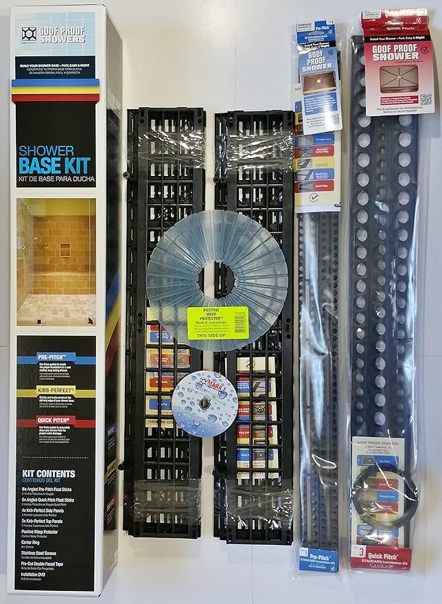 Add to wish list add to compare. Two level vials are supplied to indicate the proper minimum water drainage slope of 1/4 per 12 run. Included in each package is 1 center ring and 6 standard float sticks that fit into any of the 24 slots on the center ring. Industries 4 products that simplify installing a shower including installing a shower pan and tile. Goof proof shower 7 in. Goof proof black polystyrene shower kit. Wheelchair accessible and ada compliant; Goof proof showers shower floor and curb installation kit. Goof proof showers positive weep hole protector. Shower curbs included and designed not to puncture the liner. Customizable to 6 length combinations ranging from 27 to 60 tileable insert top (no metal grates available) with female receivers to attach quick pitch float sticks directly to the drain. In order to install a proper shower floor, the base of the shower has to have a proper slope for drainage. Quick pitch® is a revolutionary new product that will completely change the way in which a mortar bed is installed.